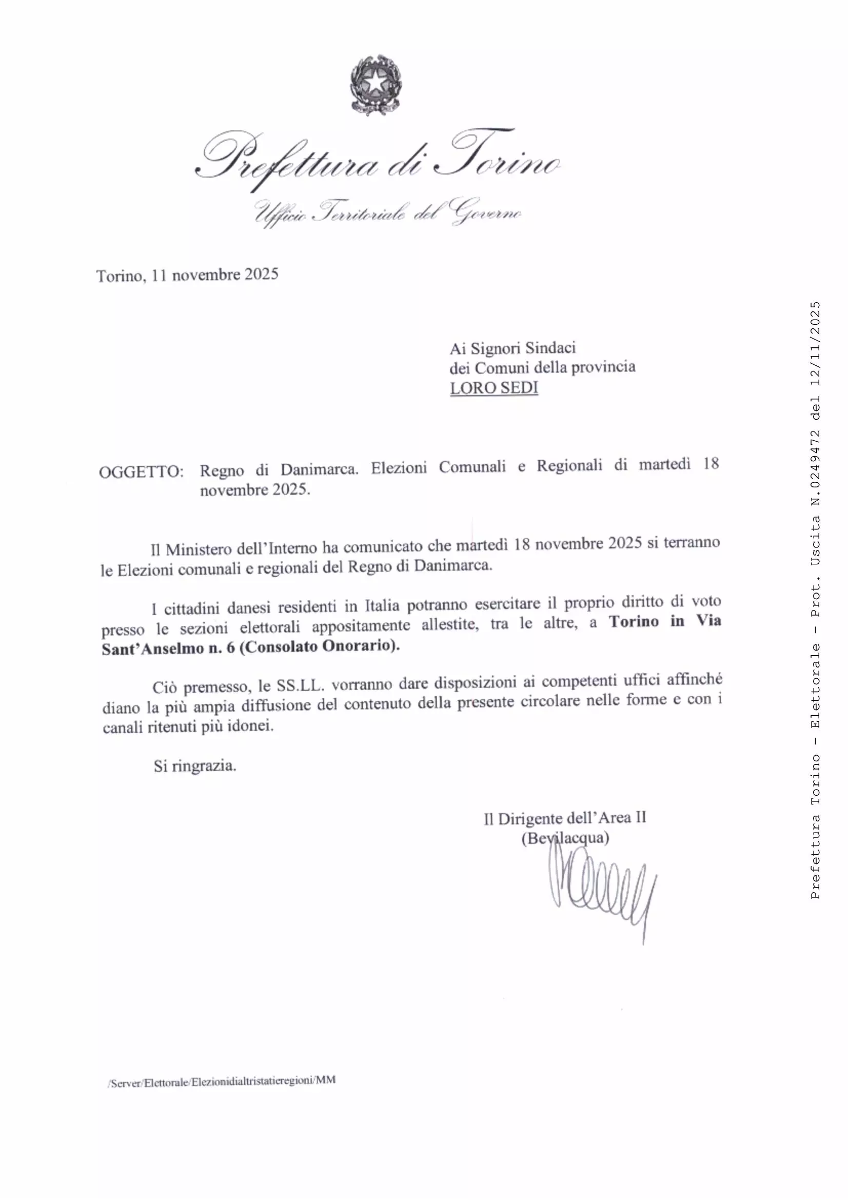I cittadini danesi residenti in Italia potranno esercitare il proprio diritto di voto presso le sezioni elettorali appositamente allestite a Torino in Via Sant'Anselmo n. 6 (Consolato Onoario).